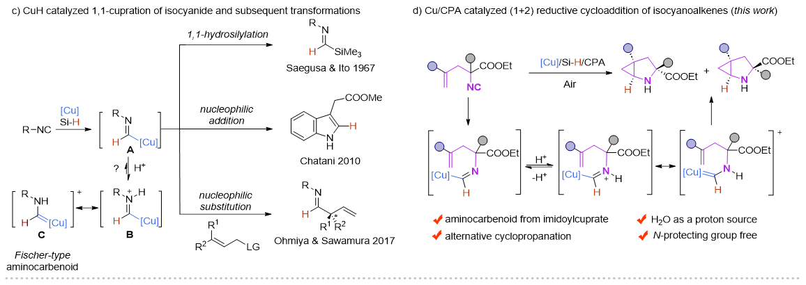 近年來(lái),Cu-H催化的烯烴的1,2-氫官能化反應(yīng)取得了飛速的發(fā)展,尤其是在對(duì)映選擇性氫胺基化領(lǐng)域,Buchwald課題組做了開(kāi)創(chuàng)性且系統(tǒng)性的工作 (Acc. Chem. Res. 2020,53,1229?1243)。但與此形成鮮明對(duì)比的是,Cu-H催化的異腈的1,1-氫官能化反應(yīng)模式相對(duì)單一,這主要是由于形成的甲酰亞胺銅中間體是親核性的,只能發(fā)生親核取代和親核加成反應(yīng)。在此前的報(bào)道中,一些過(guò)渡金屬諸如Ni,Co,很容易與異腈配位形成亞胺金屬絡(luò)合物。在酸性條件下,這類物種更傾向于異構(gòu)形成一類新型的氨基金屬卡賓(Organometallics.,2003,22,2817?2819;Organometallics.,2021,40,968?978),但這類物種活性尚未被廣泛研究。