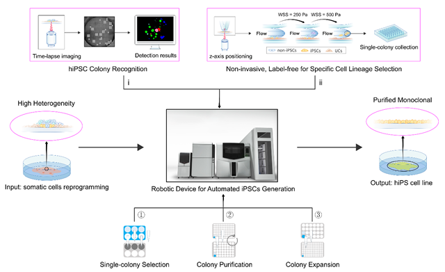 近日,中國科學院廣州生物醫(yī)藥與健康研究院(廣州健康院)張驍研究員團隊提出一種基于結(jié)構(gòu)微流體創(chuàng)新的譜系細胞單克隆自動化獲取策略,以無標記、無酶活反應參與、非侵入式的方式,在體細胞重編程過程出現(xiàn)的復雜譜系中實現(xiàn)了對特定譜系的單克隆性細胞的自動化獲取,并研發(fā)出基于結(jié)構(gòu)微流體的細胞單克隆獲取整機技術(shù)(圖1)。該原創(chuàng)性策略被部署于廣州健康院前期自主研發(fā)的自動化干細胞誘導培養(yǎng)裝備,提高了人誘導多能干細胞(hiPSCs)單克隆的獲取效率與純度,提升了系統(tǒng)魯棒性(robustness)及縮短了體細胞重編程后持續(xù)純化hiPSCs(sub-cloning)的建系周期。相關(guān)研究成果以“Selecting Monoclonal Cell Lineages from Somatic Reprogramming Using Robotic-Based Spatial-Restricting Structured Flow”為題在國際權(quán)威學術(shù)期刊?Research?上在線發(fā)表。