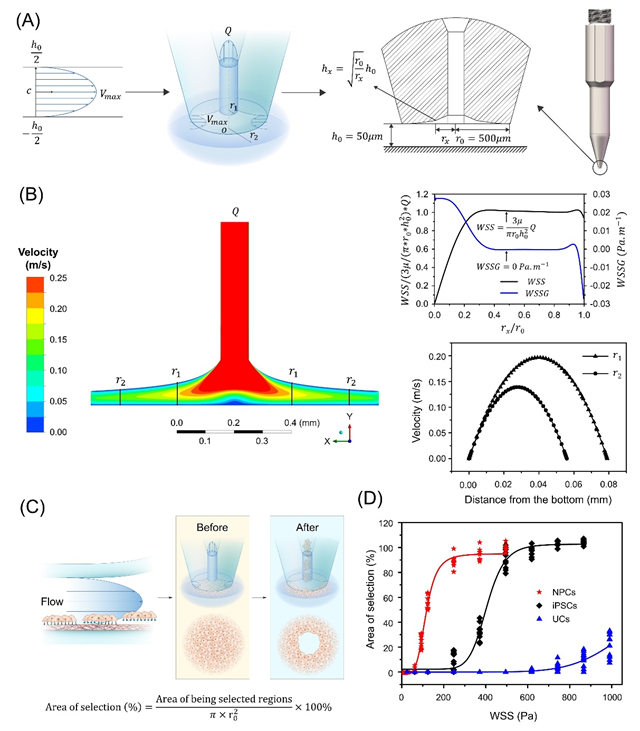 隨后,作者基于流體動力學原理設(shè)計了以可以產(chǎn)生局部結(jié)構(gòu)微流體的細胞獲取微型挑針結(jié)構(gòu)(PTMS),機械團隊克服了流場效果與多曲面加工實現(xiàn)的難題,反復校驗加工結(jié)構(gòu),最終基于PTMS產(chǎn)生的結(jié)構(gòu)微流體(PTMS-FLOW)實現(xiàn)了對基于空間限位譜系細胞的特異性挑取。此外,研究證明了PTMS-FLOW可根據(jù)流速變化在Z軸-h0的為常量的條件下,應對不同細胞類型的粘附力差異,實現(xiàn)以無標記、無酶活反應參與、非侵入式、和非接觸的方式對不同譜系細胞進行特異性的選擇。該研究證明了結(jié)構(gòu)微流體是作為分離/選擇特定譜系類型粘附細胞的可自動化的技術(shù)路徑,為后續(xù)進一步研究譜系細胞單克隆的自動化獲取提供了理論基礎(chǔ)(圖2)。