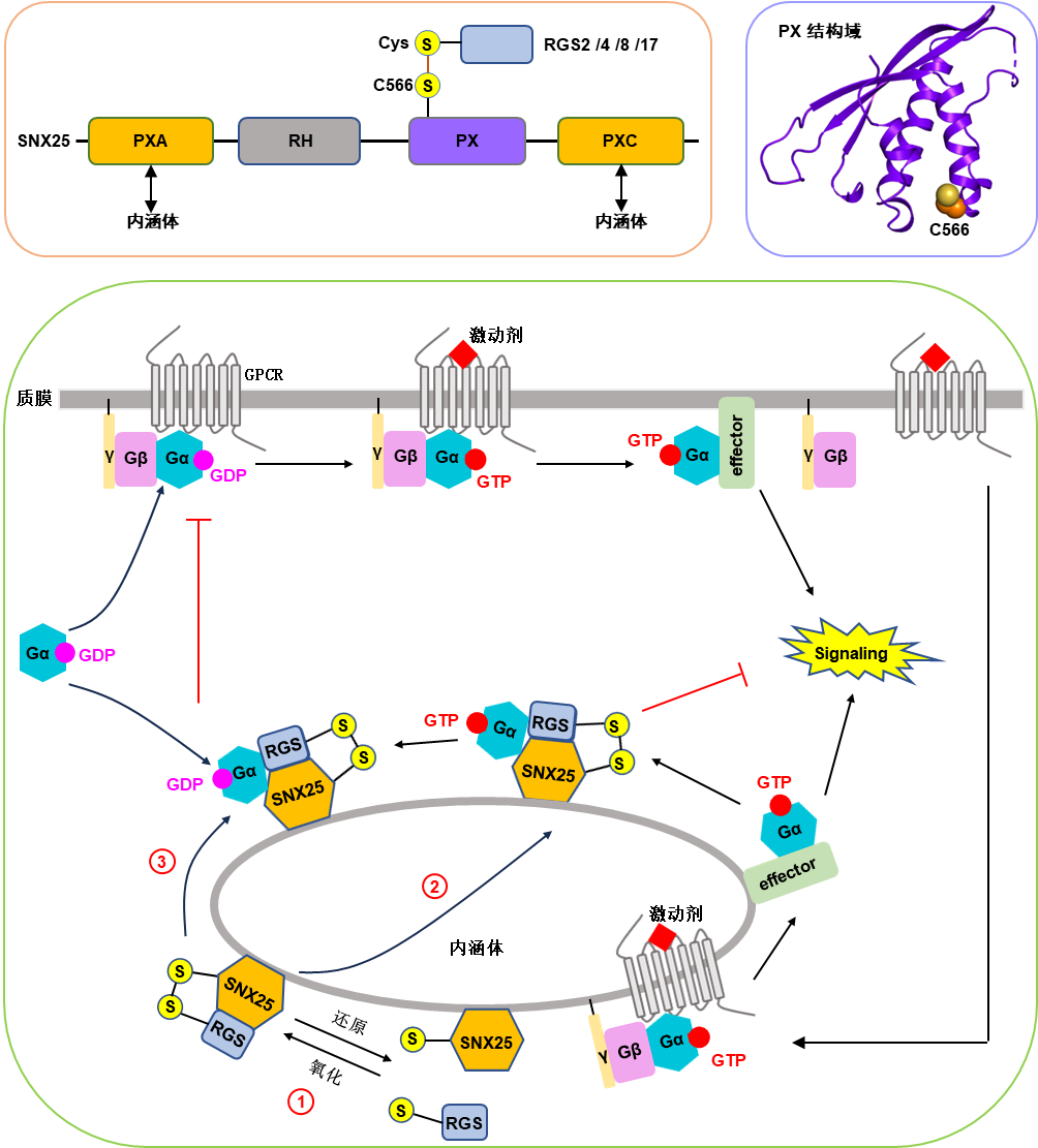 研究團(tuán)隊(duì)利用免疫沉淀-質(zhì)譜聯(lián)用技術(shù)和熒光共定位等實(shí)驗(yàn)方法,發(fā)現(xiàn)SNX25的PX結(jié)構(gòu)域能結(jié)合一些經(jīng)典的RGS蛋白,包括RGS2、RGS4、RGS8和RGS17。通過(guò)結(jié)構(gòu)生物學(xué)和細(xì)胞生物學(xué)實(shí)驗(yàn),研究團(tuán)隊(duì)發(fā)現(xiàn)SNX25與RGS蛋白的相互作用主要依賴SNX25-PX結(jié)構(gòu)域中C566與RGS蛋白N端半胱氨酸形成的分子間二硫鍵,且該相互作用受氧化還原的調(diào)控。通過(guò)熒光共定位實(shí)驗(yàn),團(tuán)隊(duì)進(jìn)一步發(fā)現(xiàn)PXA和PXC結(jié)構(gòu)域可以介導(dǎo)SNX25靶向內(nèi)涵體。通過(guò)招募經(jīng)典RGS蛋白到內(nèi)涵體,SNX25可以促進(jìn)內(nèi)涵體上Gαi/q蛋白的失活,最終抑制內(nèi)涵體上GPCR-Gi/q偶聯(lián)的信號(hào)轉(zhuǎn)導(dǎo)(圖1)。