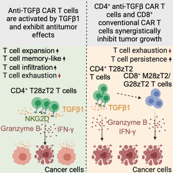 近日,中國科學(xué)院廣州生物醫(yī)藥與健康研究院等機(jī)構(gòu)在Cell Reports Medicine發(fā)表題為“CD4+?anti-TGFβ CAR T cells and CD8+?conventional CAR T cells exhibit synergistic antitumor effects”的研究論文。該研究首次證實CD4+靶向TGFβ的CAR-T細(xì)胞(T28zT2 T細(xì)胞)與CD8+靶向GPC3或MSLN的CAR-T細(xì)胞聯(lián)合應(yīng)用具有協(xié)同抗腫瘤效應(yīng),為實體瘤免疫治療提供了全新策略,并同步啟動針對肝癌和胰腺癌等實體瘤的相關(guān)臨床研究(NCT03198052)。