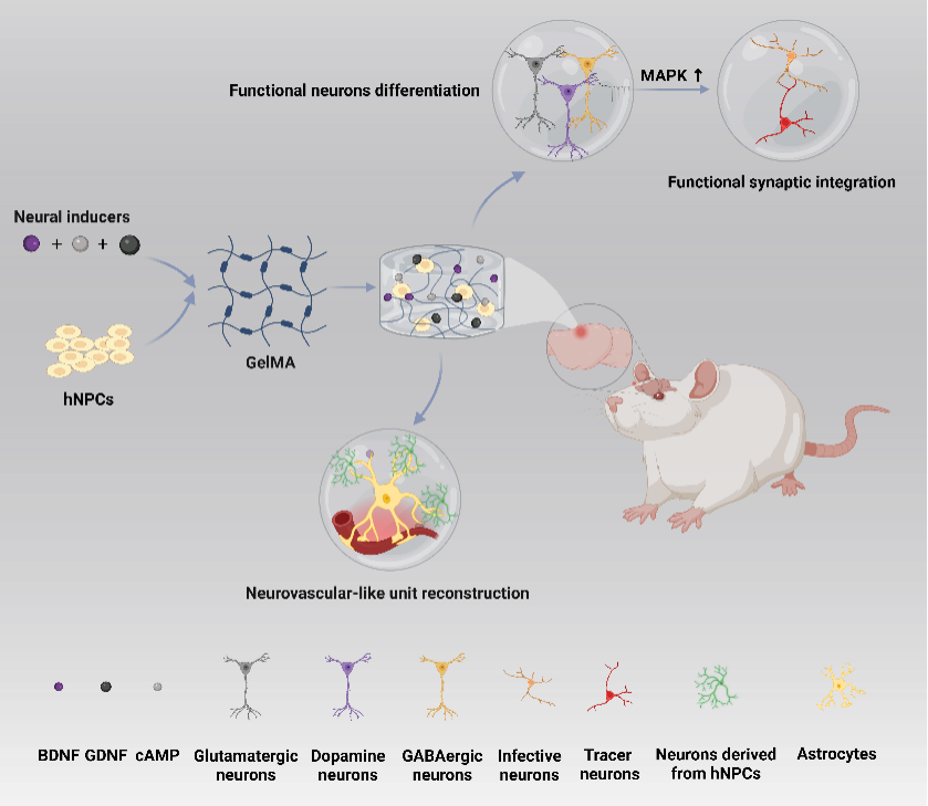 近日,中國(guó)科學(xué)院廣州生物醫(yī)藥與健康研究院巫林平研究員和潘光錦研究員團(tuán)隊(duì)聯(lián)合在Journal of Advanced Research發(fā)表題為?"A cocktail hydrogel promoting the functional interneurons regeneration of human neural progenitor cells for brain injury therapy"?的研究論文。該研究從材料微納結(jié)構(gòu)調(diào)控與組織微環(huán)境模擬的雙重維度出發(fā),構(gòu)建了一種富含神經(jīng)調(diào)控因子的雞尾酒水凝膠,并闡明其在介導(dǎo)人源神經(jīng)前體細(xì)胞(hNPCs)向皮層中間神經(jīng)元分化及突觸連接形成過程中的作用機(jī)制,同時(shí)該水凝膠可以促進(jìn)體內(nèi)神經(jīng)血管單元(neurovascular?unit, NVU)的重建,修復(fù)受損的腦組織。本研究為腦皮層損傷的細(xì)胞替代治療提供了重要的理論依據(jù)和新的治療策略。