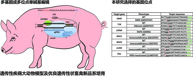 單堿基編輯器出現(xiàn)以后,很快被廣泛地運(yùn)用于動(dòng)物、植物和人細(xì)胞的基因編輯。但是,以往的研究主要集中在單位點(diǎn)的堿基突變。而人類遺傳性疾病以及動(dòng)物遺傳性狀改變往往涉及到多個(gè)位點(diǎn)的單堿基突變,因此,對(duì)基因組的多個(gè)位點(diǎn)進(jìn)行單堿基編輯才更有可能培育出能夠模擬人遺傳性疾病的大動(dòng)物模型和擁有優(yōu)良遺傳性狀的畜禽新品系。