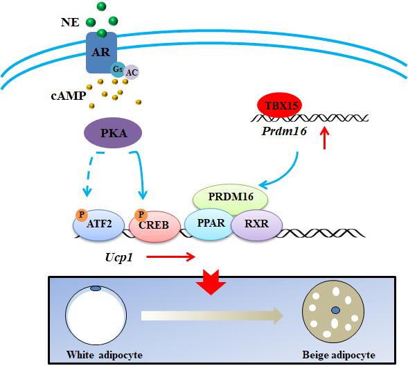 肥胖及其相關(guān)代謝疾病包括Ⅱ型糖尿病、心血管疾病和癌癥等嚴(yán)重威脅人類健康。肥胖的發(fā)生主要由能量失衡導(dǎo)致,因此提高機(jī)體能量消耗能夠有效抑制肥胖發(fā)生。哺乳動物體內(nèi)的褐色脂肪細(xì)胞和米色脂肪細(xì)胞中特異性高表達(dá)解偶聯(lián)蛋白1(UCP1),可以將能量轉(zhuǎn)化為熱量,從而促進(jìn)能耗。通過激活褐色脂肪細(xì)胞產(chǎn)熱及促進(jìn)米色脂肪細(xì)胞生成,進(jìn)而提高機(jī)體能耗,已成為治療肥胖及代謝相關(guān)疾病的研究熱點(diǎn)。