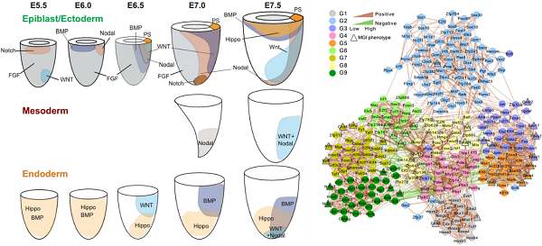 圖3. 胚層關(guān)鍵信號作用區(qū)域及關(guān)鍵轉(zhuǎn)錄因子調(diào)控網(wǎng)絡(luò)