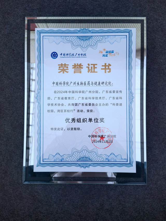 活動(dòng)現(xiàn)場(chǎng)還頒發(fā)了“中國科學(xué)院科普進(jìn)校園灣區(qū)百校行”優(yōu)秀組織獎(jiǎng),廣州健康院榮獲此獎(jiǎng)項(xiàng)。