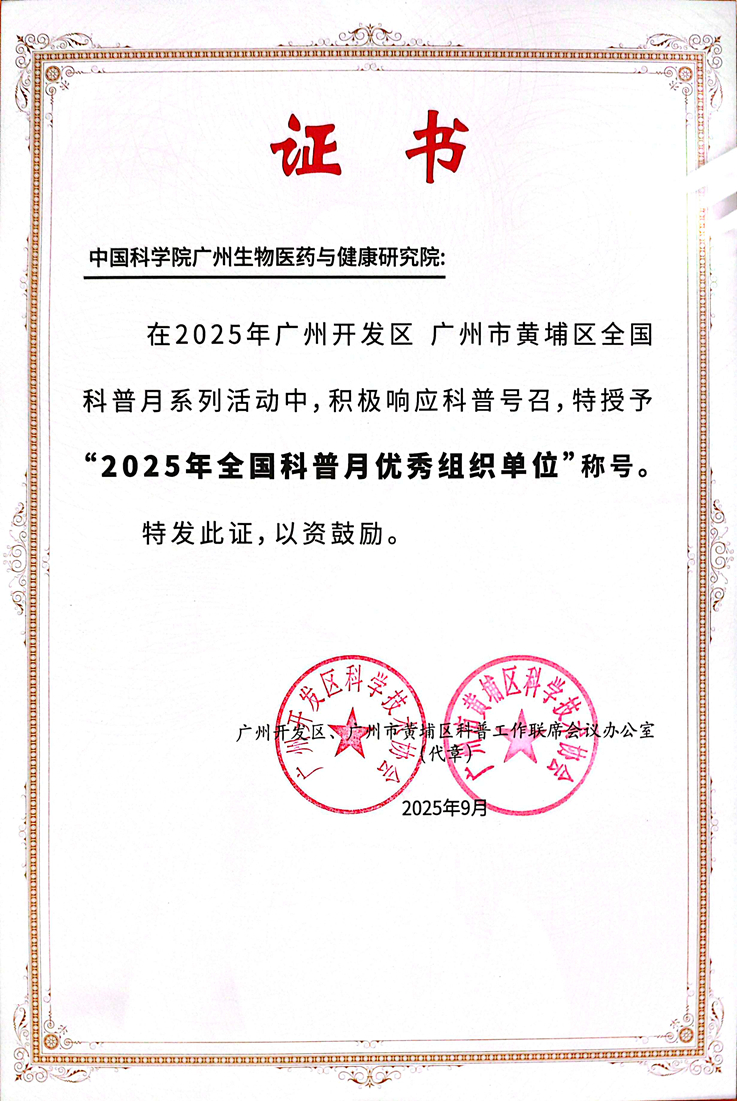近日,中國(guó)科學(xué)院廣州生物醫(yī)藥與健康研究院(以下簡(jiǎn)稱(chēng) “廣州健康院”)憑借在全國(guó)首個(gè)科普月期間的出色組織能力、豐富活動(dòng)形式及顯著社會(huì)成效,獲得黃埔區(qū)授予的“2025年全國(guó)科普月優(yōu)秀組織單位”稱(chēng)號(hào)。