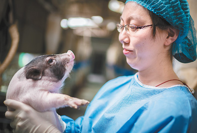 圖為科研人員與亨廷頓疾病基因敲入豬。中科院廣州生物醫(yī)藥與健康研究院供圖(新華社發(fā))