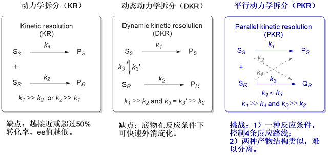 獲得手性化合物的單一對映異構(gòu)體最常見的途徑是對非手性底物的不對稱催化轉(zhuǎn)化,對映選擇性地產(chǎn)生手性因素。另一種主要途徑是把已經(jīng)含有手性因素的外消旋體混合物轉(zhuǎn)化為單一的對映異構(gòu)體產(chǎn)物。這一途徑可以通過以下三種策略實現(xiàn):動力學(xué)拆分(KR);動態(tài)動力學(xué)拆分(DKR);和平行動力學(xué)拆分(PKR)。KR是利用兩種對映異構(gòu)體底物在同一個不對稱催化條件下轉(zhuǎn)化為產(chǎn)物的速率不同(k1 >> k2 或 k2 >> k1),最理想的情況是50%的一種構(gòu)型的底物完全轉(zhuǎn)化為單一構(gòu)型的產(chǎn)物,而50%的另一種構(gòu)型的底物完全不反應(yīng)且能被回收。事實上隨著反應(yīng)的進(jìn)行,“劣勢”構(gòu)型反應(yīng)底物的相對濃度不斷增加,它也會參與反應(yīng),導(dǎo)致“有害”構(gòu)型的產(chǎn)物生成,從而降低產(chǎn)物的對映選擇性。而DKR策略有效克服了KR的缺點,即不斷富集的“劣勢”構(gòu)型反應(yīng)底物可以不斷地發(fā)生消旋化,部分轉(zhuǎn)化為“優(yōu)勢”底物,進(jìn)而不斷地生成目標(biāo)構(gòu)型的產(chǎn)物。理想情況下,外消旋體底物可以通過DKR可以100%轉(zhuǎn)化為單一構(gòu)型的產(chǎn)物,但是前提是兩種構(gòu)型的底物在反應(yīng)條件下可以快速互變(k1 >> k2 且 k3 >> k2)。為了克服KR和DKR的固有限制, Vedejs和Chen于1997年引入了另一種叫做平行動力學(xué)拆分(PKR)的策略,即兩種對映體底物分別沿兩條不同的反應(yīng)路徑,以相同或接近的速率轉(zhuǎn)化 (k1≈k3且k1 >> k4 且 k3>> k2),得到單一對映異構(gòu)體的兩種產(chǎn)物。在一種不對稱反應(yīng)條件下,既要實現(xiàn)化學(xué)選擇性又要實現(xiàn)對映選擇性調(diào)控,即兩種底物兩種產(chǎn)物四條反應(yīng)路線的調(diào)控是一個巨大的挑戰(zhàn)。PKR策略的另一個挑戰(zhàn)是,所得到的兩種產(chǎn)物一般結(jié)構(gòu)類似,從而造成產(chǎn)物分離非常困難,因此實用性好的PKR反應(yīng)并不多見(圖1)。