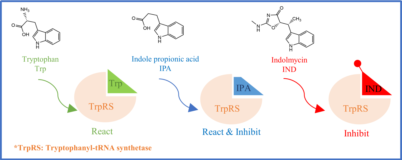 在本研究中,研究人員揭示了IPA對(duì)結(jié)核菌的新作用機(jī)制:IPA可以與結(jié)核菌TrpRS結(jié)合并干擾其催化活性來(lái)發(fā)揮其抑菌作用。TrpRS在細(xì)菌中催化兩步反應(yīng):第一步通過(guò)水解ATP激活色氨酸形成色氨酰-AMP,第二步將活化的Trp轉(zhuǎn)移到tRNATrp產(chǎn)生Trp-tRNATrp。具體而言,研究團(tuán)隊(duì)通過(guò)前期調(diào)研發(fā)現(xiàn)使用IPA和結(jié)核菌TrpRS抑制劑吲哚霉素篩選的耐藥突變結(jié)核菌中都具有相同的基因突變,這引起了研究人員的注意,從而提出IPA作為色氨酸的結(jié)構(gòu)類似物能夠占據(jù)TrpRS的色氨酸口袋發(fā)揮其抑菌作用的假說(shuō)。