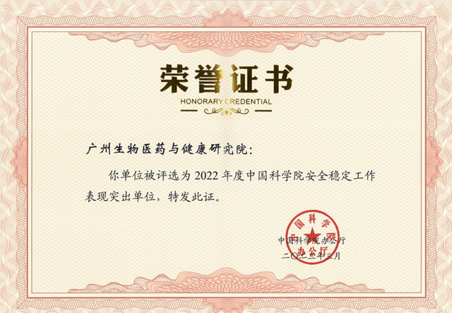 廣州健康院獲“中國科學(xué)院2022年度安全穩(wěn)定工作突出單位”稱號(hào)