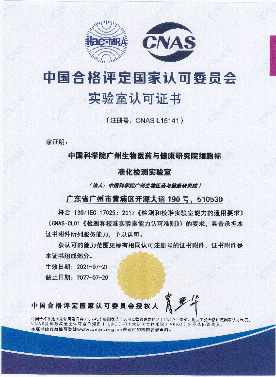 7月21日,中國科學院廣州生物醫(yī)藥與健康研究院細胞標準化檢測實驗室(以下簡稱SCTL)順利通過了中國合格評定國家認可委員會(簡稱CNAS)的實驗室認可,并獲得CNAS認可標志和認可證書,標志著SCTL的分析檢測能力達到了國際先進水平。