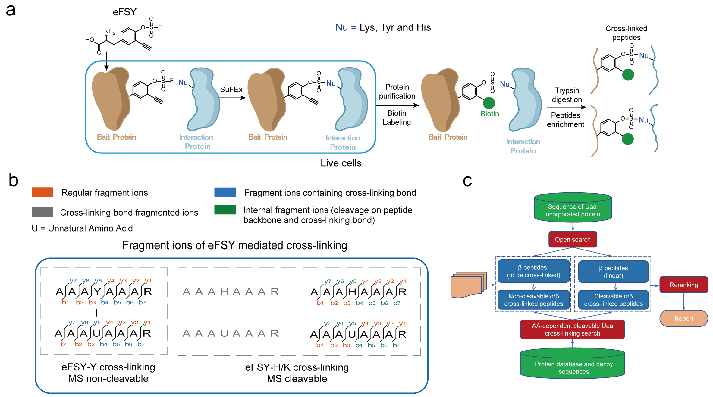 圖1?新型含氟磺酸基團的可富集化學交聯劑eFSY研究蛋白質相互作用時,鑒定交聯肽段的流程圖(a),交聯肽段的碎裂規(guī)律(b)和交聯鑒定軟件AixUaa的開發(fā)流程(c)