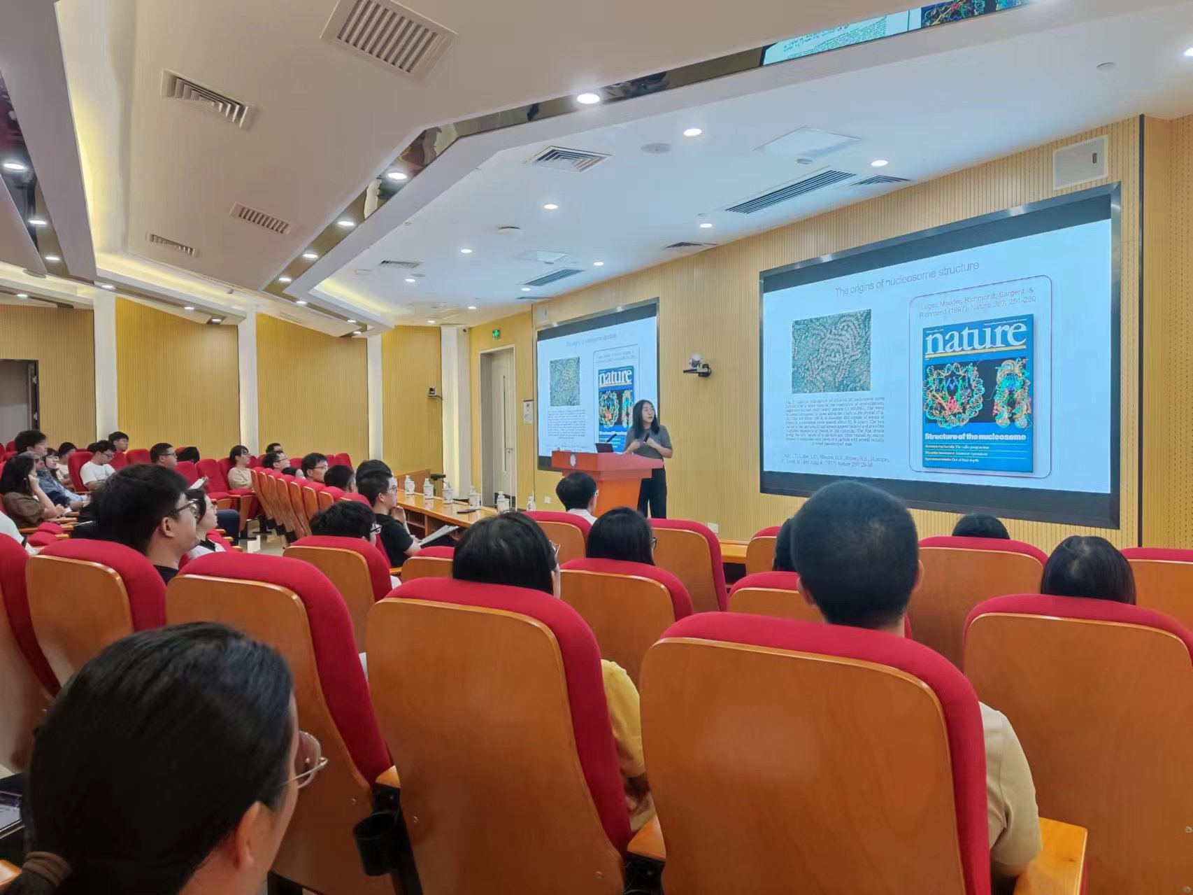 報(bào)告生動(dòng)詳細(xì)地介紹了組蛋白的結(jié)構(gòu)和染色質(zhì)形成的過(guò)程,并向與會(huì)人員展示了課題組對(duì)結(jié)構(gòu)生物學(xué)的靈活運(yùn)用,引起了在場(chǎng)師生的深入思考。會(huì)后,廣州健康院多位研究員及學(xué)生與劉揚(yáng)教授展開(kāi)了熱烈的討論。