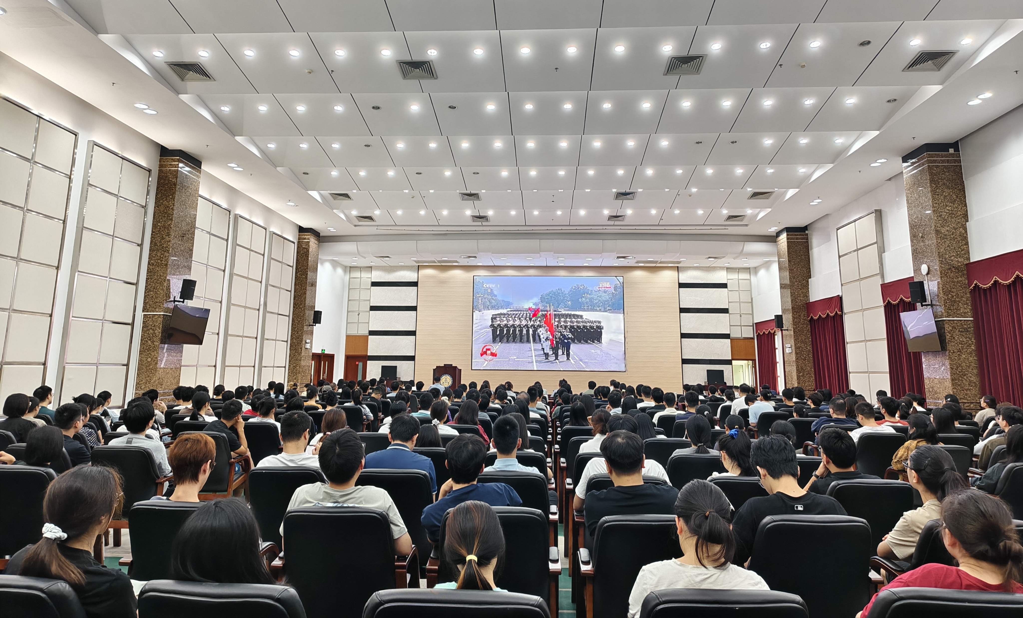觀看現(xiàn)場座無虛席。大會伊始,全體人員肅立,行注目禮,高唱國歌,氣氛莊嚴肅穆。習近平總書記的重要講話深刻回顧了抗戰(zhàn)歷史,強調(diào)了偉大抗戰(zhàn)精神的時代意義,令人深思、催人奮進。隨后的徒步方隊、戰(zhàn)旗方隊、裝備方隊和空中梯隊依次亮相,展現(xiàn)出強大的國防力量,進一步激發(fā)了師生們的民族自豪感和愛國熱情。