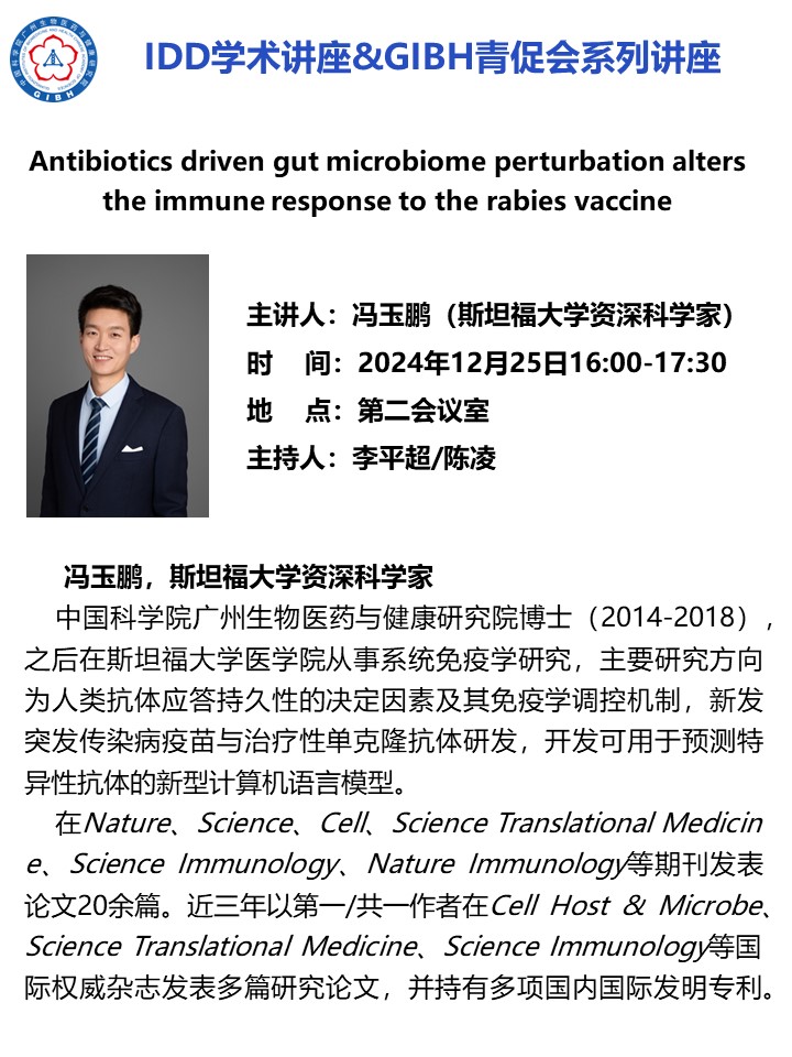 2024年12月25日IDD學(xué)術(shù)講座&GIBH青促會(huì)系列講座:Antibiotics driven gut microbiome perturbation alters the immune response to the rabies vaccine