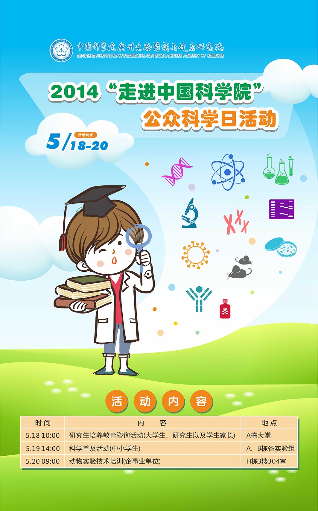 中科院廣州生物醫(yī)藥與健康研究院定于5月18-20日開展2014“走進(jìn)中國科學(xué)院”公眾科學(xué)日活動,介紹宣傳生物院的研究成果及平臺支撐能力,宣傳生物院近年來的教育成效,吸引優(yōu)秀生源,提升生源質(zhì)量;參觀、講解結(jié)合普及科學(xué)常識,輔以給學(xué)生動手參與和實際觀看實驗過程,激發(fā)青少年對科學(xué)的興趣,樹立良好的科技創(chuàng)新理念。具體活動安排如下: