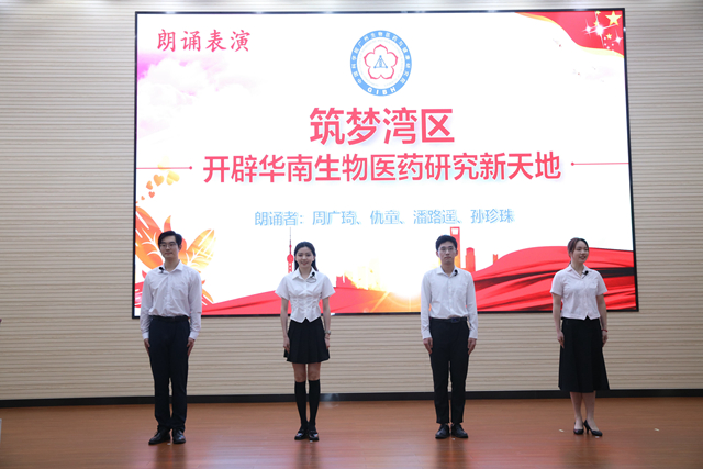 今年是廣州健康院建院20周年,在讀研究生周廣琦、仇童、潘路遙、孫珍珠四位同學獻上朗誦表演《筑夢灣區(qū),開辟華南生物醫(yī)藥研究新天地》,展現(xiàn)了廣州健康院人不忘初心,砥礪奮進,努力實現(xiàn)高水平科技自強自立的成長歷程和決心。