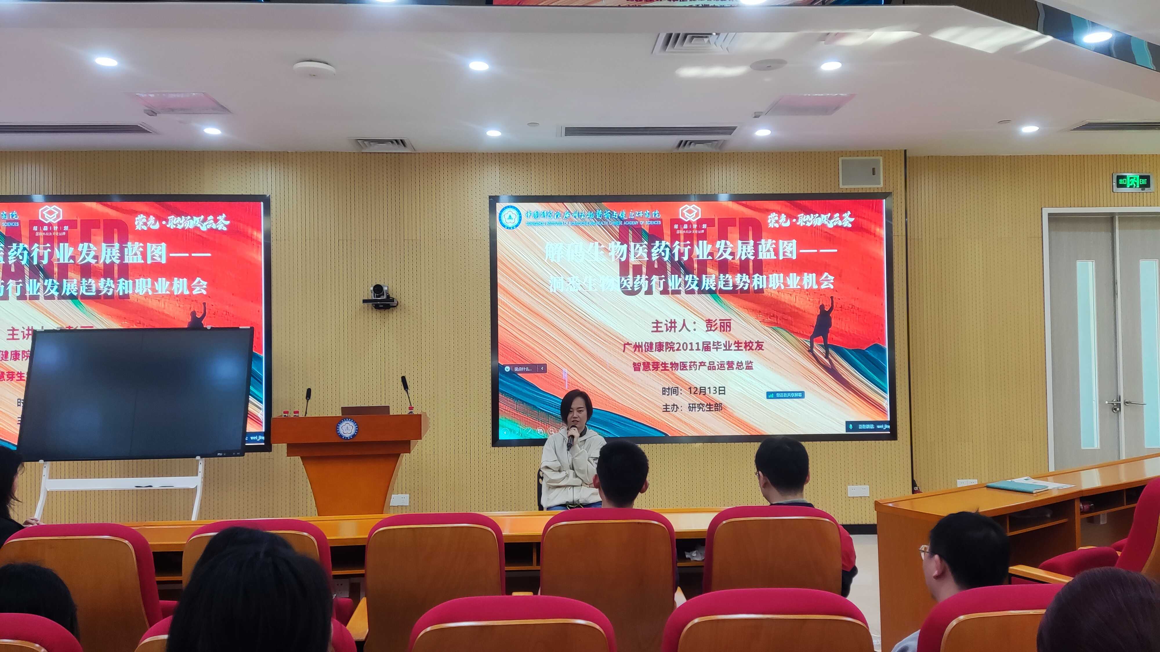 為助力研究生職業(yè)規(guī)劃,幫助研究生了解生物醫(yī)藥行業(yè)未來職業(yè)趨勢和職業(yè)機(jī)會(huì),12月13日,廣州健康院舉辦“解碼生物醫(yī)藥行業(yè)發(fā)展藍(lán)圖——洞悉生物醫(yī)藥行業(yè)發(fā)展趨勢和職業(yè)機(jī)會(huì)”專題交流會(huì),邀請(qǐng)2011屆畢業(yè)生校友彭麗來院與在學(xué)研究生座談交流。