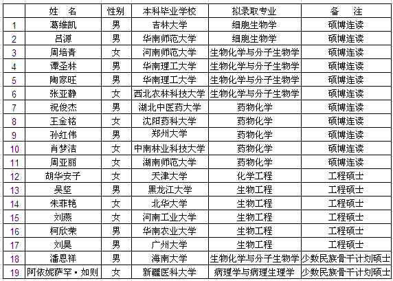 根據(jù)參加2015年全國碩士研究生統(tǒng)一入學(xué)考試考生初試、復(fù)試成績,經(jīng)我院教育委員會審核通過,2015年我院擬錄取19名統(tǒng)考碩士(碩博連讀)研究生,名單如下: