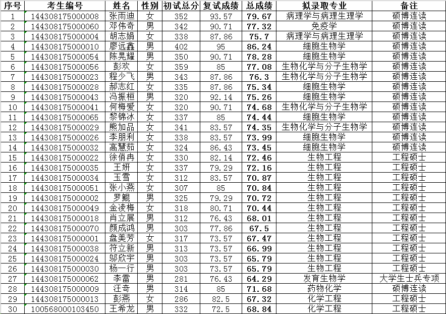 根據(jù)參加2018年全國(guó)碩士研究生統(tǒng)一入學(xué)考試考生初試、復(fù)試成績(jī),經(jīng)我院教育委員會(huì)審核通過(guò),2018年我院擬錄取30名統(tǒng)考碩士(碩博連讀)研究生,名單如下: