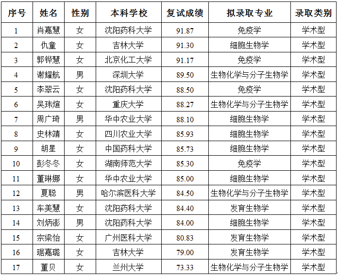經(jīng)我院招生工作小組考核,2021年我院擬錄取推薦免試碩士(碩博連讀)研究生17名,其中碩博連讀研究生(學術型)17名?,F(xiàn)將名單公示如下: